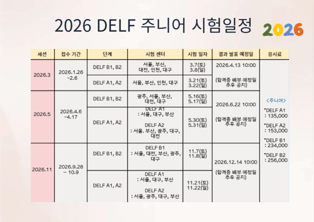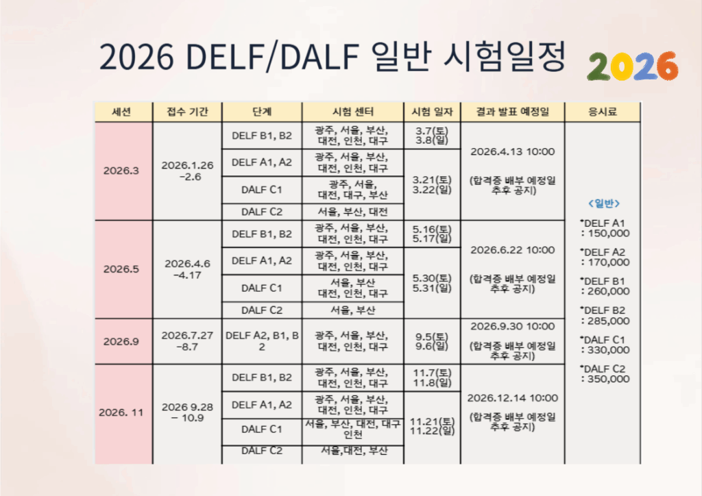 대한민국에서는 주한 프랑스 문화원이 시험을 총괄함과 동시에 서울권 시험을 진행하고 있으며,서울 외에도 5개의 지역(인천, 부산, 대전, 광주, 대구)에 있는 알리앙스 프랑세즈가 시험을 진행합니다.